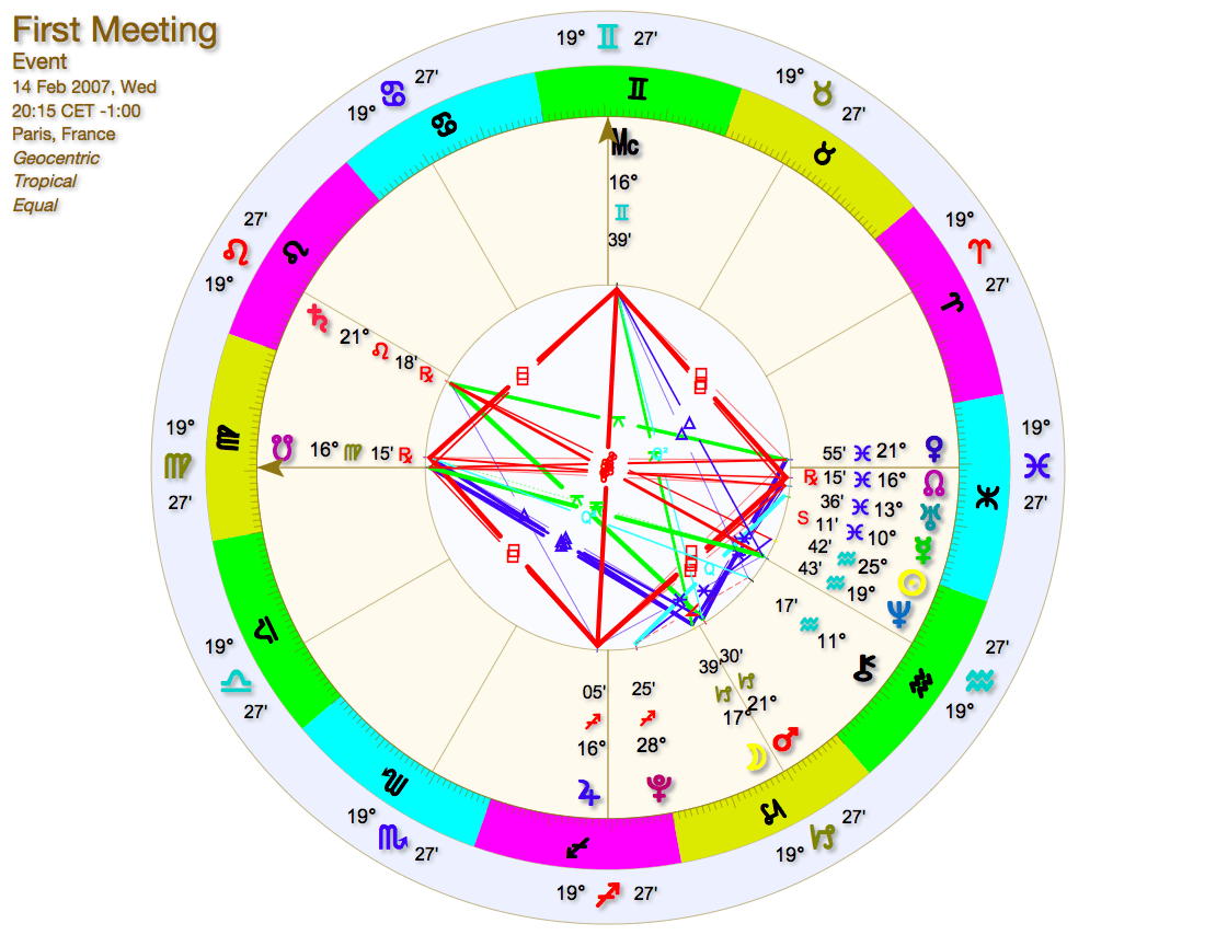 Le thème horaire est la date de la première rencontre. Or le moment de la rencontre recèle en elle-même souvent, inconsciemment déjà une empreinte de l’échange future. Etudier la rencontre permet de rendre conscient cette empreinte inconsciente et de mieux appréhender l’information intuitive qui n’est pas encore devenue consciente.