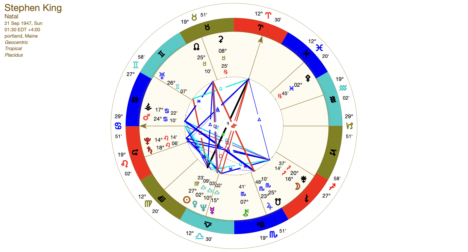 — Stephen Kings horoscoop illustreert dit treffend: Mercurius is verbonden met Pluto, Saturnus, de Maan, Neptunus, Mars/Vesta en het Medium Coeli, en staat bovendien in quintiel met de maansknopen. Dit verfijnde netwerk verklaart voor een groot deel zijn uitzonderlijke gave als schrijver en filmmaker.